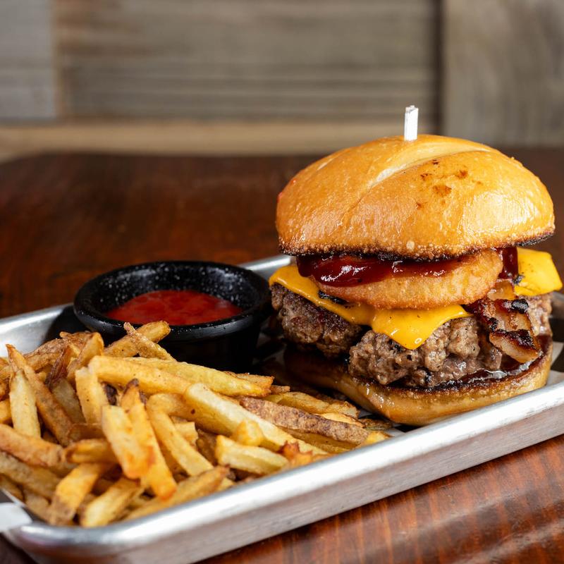 Quarter-pound Angus beef patty, lettuce, tomato, onion, pickles, mayonnaise, mustard and ketchup on a fresh bun.